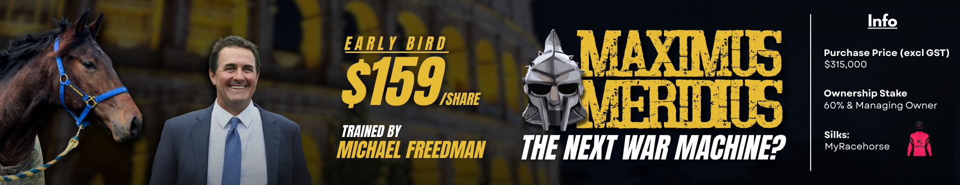 This exciting colt will join the Randwick stable of Michael Freedman, the reigning Golden Slipper-winning trainer who also prepares MyRacehorse talents Ninja and Apocalyptic. For Freedman, pedigree alone is not enough, he judges each horse on type and ability, and he has been quick to praise Maximus Meridius for his athleticism, lightness on his feet, and his smooth, fluid action. While he is not expected to be an early two-year-old, he is the kind who will develop powerfully through his late juvenile season and excel as a three-year-old when stamina and scope begin to matter most. Freedman has no doubt he will furnish into a colt capable of competing in Guineas and Derby races, with the long-term ambition of open-age Group 1 competition.